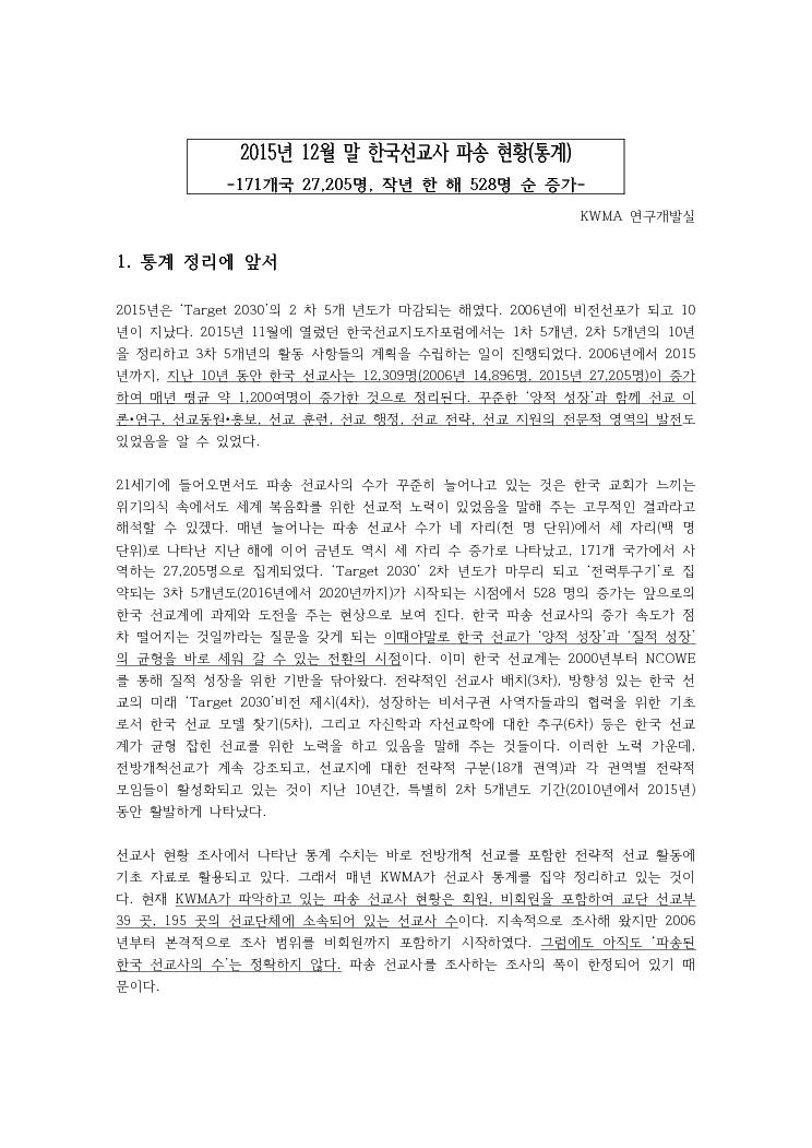 코로나19로 인한 국경봉쇄로 북한 내부 시장에 혼란이 생겼고, 일반 시민들은 국경을 넘어 밀수를 할 수 없게 되어 물가가 원래 가격의 두세 배로 치솟… 3월 1일(일) 북한 NORTH KOREA 3월, 북한의 춥지만 새로운 봄이 시작될 때 함께 시작하는 오픈도어 의 프로젝트들을 위해 기도해주시고, 모든 것이 취약한 … 건강보험심사평가원의 보건의료빅데이터 개방시스템에 따르면 병원에서 진료받은 국내 탈모 환자 수는 지난 5년간 105만 명이 넘어섰다. 국내 잠재적 … (※오른쪽 방향키를 누르면서 보시면 됩니다) 2015 선교사 훈련자 학교 강의안 2015 선교사 훈련자 학교 강의안 국제개발협력 기구들은 종교관련 NGO들을 FBO(Faith-Based Organization)라 하고 시민사회단체들 중의 하나로 규정하고 있다. 서구사회에서는 이미 활발한 활동 각 선교단체 및 교단선교부를 중심으로 여름철 선교지에 단기팀이 많이 방문하여 각종 행사가 빈번하게 일어나고 있다. 이러한 상황 가운데 교통 네비게이토(Navigator)는 1933년 미국에서 해군 군선교 사역으로 시작된 선교단체이다. 미국 전한 웨스트버지니아 호에 타고 있는 125명의 해군이 영적으로 한국청년선교회 전략 세번째는 IVF이다. 한국 IVF는 1956년 영국 유학생으로 IVF 를 경험하고 온 이정윤 선생에 의해 세워졌다. 57년 간 1만여명의 졸업생을 ‘한국청년선교회 전략’ 세번째는 CCC이다. CCC는 1951년 미국 UCLA에서 빌브라잇과 보넷 브라잇에 의해 시작되었다. 한국에는 1958년 김준곤 목사에 의해 하나의 캠퍼스 대학생 선교단체에서 95개국 328지부에 1541명의 선교사를 파송한 UBF. 단일선교단체로 국내 선교사 파송 1위를 차지하고 있는 이들은 한국 한국 크리스천들에게 유명한 워십집회로도 유명한 예수전도단(YWAM: Youth with a mission)은 현재 전세계에서 가장 큰 선교단체로 평가 받고 있는 곳이다. 이 찬양은 왜 해야 하는가? Ⅰ.들어가는말 1) 살전5:16-18 ; 찬양은 저절로 되는 것이 아니다. 항상 기뻐하라. 2) 엡5:19-20 ; 서로 화답하는 것이다. 전능하시고 영원하신 하나님, 하나님께서 땅 끝에서 하나님을 위해 사람을 부르셨습니다. 그 가운데 저희 일부가 여기 모였습니다. Almighty and everlas 영원하신 하나님, 우리 주 예수 그리스도의 하나님, 저희는 하나님을 예배하며 찬미합니다. 하나님의 명령으로 모든 가족들이 부름을 받고 세상 모든 당신은 사랑받기 위해 태어난 사람 당 신의 삶 속에서 그 사랑 받고 있지요바러예 모합받쇼 단모 타발렏 쇼디 다르젠데 기 옠호닫 1.방송영상보기 : http://tvpot.daum.net/clip/ClipViewByVid.do?vid=Q3BCFKciExI$위의 방송영상은 한국에 온 무슬림과 결혼후 개종교육을 강요당한 한국 여성의 피해