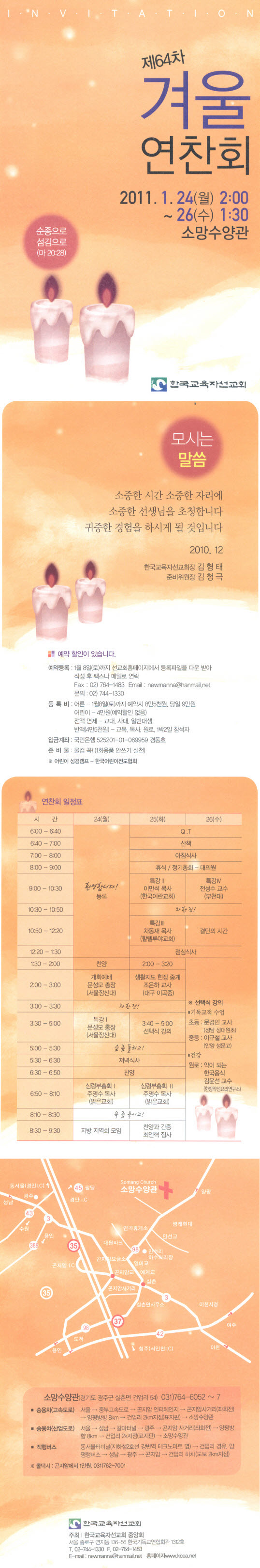 안녕하세요. 기아대책 기아봉사단 훈련 안내드립니다. 기아봉사단 훈련은 기아봉사단원으로 파견되기 위한 필수 훈련과정으로1,2단계(4주 동동체)로 샬롬! 성탄절기에 주의 평강으로 문안드립니다. 총회세계선교부에서 준비하는 시니어 선교사 전략포럼 소식을 전합니다. 2011 PCK 시니어선교사 전략 날짜 : 2011년 1월 28~29일 (금~토) 시간 : 추후공지 장소 : 충북 청원군 현도면 매봉리 '갈멜산 전원교회 기도원' 자세한 내용은 추후에 홈페이지를 일시 : 2011년 1월 중순지역 : 중국남부지역경비 : 99만원(비자비 별도)등록마감 : 12월 24일 문의 : 053-942-0089 자세한 사항을 원하시면 연락바랍니다. < 다모임의 밤 > 올 한해도 불어권 선교회와 함께해주신 모든 가족들과 함께하는 자리입니다. 이 글을 보시는 모든 분들을 초청합니다!^^ 식사준 ● 제 목 : 이슬람세미나● 지역/일시 : 서빙고 (2010.12.05 ~2010.12.19) 이슬람세미나 1. 일정 : 2010.12.05(주일) - 19(주일) 매주일 16:30-17:30,   12월 2일(목) 일본어예배 (호리에히로시 목사)설교는 일본에서 문서선교 사역을 하셨고, 현재 사랑의 교회 일본어예배부에서 사역하고 계시는 호리에 필리핀 DFC선교훈련원(DTI-Missions) 훈련생 모집1.기간 25기: 2011.2.1-8.31(7개월)26기: 2011.7.1-2012.2.29(8개월)2. 대상제자화 사역을 훈련받기 원하는 모든 그리스 제1회 북아프리카 선교 대회가 열립니다.일시 : 2011년 2월 25일(금) 오전~장소 : 부천참빛 교회 * 자세한 시간과 프로그램은 추후 공지하겠습니다. &nb 제11회 선교헌신자 세미나 세상을 향한 하나님의 마음!열정의 집회, 뜨거운 마음, 헌신의 결단...잃어버린 영혼을 향한 간절한 마음,사역을 향한 열망 • 국제 YWAM 경험과 선교지에서의 사역경험이 풍부한 강사진 • 매주 와이키키 거리 전도와 UH(하와이대학)에서의 캠퍼스 전도 • 호놀 주님의 이름으로 문안드립니다. 명성교회 부설 한국선교연구센터가 개최하는 2011년 선교사안식년세미나가 아래와 같이 개최됩니다. 관심 있으신 분 선교사관리정책에 따라 금번에 제6회 서남아시아선교사대회가 아래와 같이 개최하게 되었습니다. 금번 대회를 통하여 서남아시아선교 역사와 사역현 2010년 해외사역지원팀의 사역을 돌아보며 올 한해도 CBMC 해외사역지원팀의 다양한 사역에 함께 하여주신 하나님께 감사와 영광을 올려드립니다. 해 - 12주 과정의 인카운터이슬람을 4박 5일로 경험하실수 있는 기회!! - 2011년 1월 목회자 및 선교사님 그리고 교회 선교부 담당자들을 위해 인텐시브 코스 초겨울 문턱에 들어선 11월 하순입니다. 쌀쌀해진 날씨로 마음까지 얼어붙을 순 없겠지요. 하지만 남북의 상황이 마음 같지만은 아닌 것 살롬!아프리카 에이즈 구호 병원 건립을 위한 지라니 합창단 초청공연을 2010년 12월 2일(목)오후 6시30분 안양아트센터 관악홀에서 있습니다. 공연문의