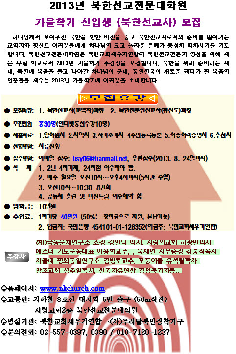 Ⅰ. 교육목적선교 현장의 다양하고, 수많은 필요를 선교본부에서 보다 전문적이고, 체계적으로 지원하기 위하여 본부의 행정 실무자가 갖추어야 한국 컴미션의 주최 아래 진행되는 CMS(Come Mission School)는 해외선교에 있어서의 심화과정을 배우는 과정이다. 10주간 매주 화요일 저녁, 강의 및 소그 한국창조과학회에서 21세기 목회와 선교 현장에서 창조신앙의 회복과 강력한 선교의 도구가 되어지는 창조과학 컨텐츠 보급을 위하여 제2회 선교사와 한국기독교의료선교협의회가 주최하는 제13차 의료선교대회가 10월 3일부터 5일까지 대전 새로남교회에서 진행된다. 매 2년마다 열리는 이 대회는 올해 이번 9월 2일부터 4일까지, 경기도 소재 온누리교회 Acts29 Vision Villaged에서 한국외국인선교회의 주관으로 이주민 사역자, 교회개척자 및 소그룹 인도 SIMTI(Serving in Mission Korea Training Institute) 란?타문화권 선교를 준비하는 선교사 후보생들이 집중적인 영어훈련과 타문화권 이해 선교관련강의 공동체 훈 불어권 선교를 위한 길잡이(IMF)는 선교일반과 불어권선교에 대한 구체적인 이해를 통해 비전을 갖게 하며 CCMF와 동역의 관계를 형성하기 위한 훈련프 KWMA 훈련분과위원회에서는 오랫동안 준비 및 추진해온 ‘선교사 전생애 선교훈련과 그 적용’의 일환으로 아래와 같이 본부사역(안식년)선교사 세 -일시 : 8월 31일(토) ~ 9월 9월(월-강사 : 바나바 목사님(베트남 현지 교회 지도자)-문의 : 02-596-3171-주최 : 오픈도어선교회오픈도어 선교회는 『2013 기독교캠프코리아 주관 여름대학 및 청년 캠프가 오는 8월 12일부터 14일까지 1차, 8월 14일부터 26일까지 2차로 나누어 경기도 시흥 소재 한국산 오는 8월 18일 주일 저녁 7시, 시청 앞 서울광장에서 라이즈업코리아 818 대회가 개최된다. 또한 같은 장소에서 저녁 6시, 라이즈업 청소년 페스티벌 행사 한국목회자선교협의회(KPMA)가 최바울 인터콥 대표를 초청하여 8월 30일 오전 10시부터 오후 4시까지 안양시 동은교회에서 이슬람선교세미나를 개최한다 북한선교전문대학원이 2013년 가을학기 프로그램을 진행한다.대치동 사랑교회에서 매주 월요일 오전 10시부터 오후 4시까지 강의가 진행되며&nbs 세계목회자 및 선교사 자녀를 위한 WPK(World Pastor`s Kids)가 목회자 자녀들의 회복을 위해 ‘2013 WPK 여름수련회’를 8월 15일부터 17일까지 부산 호 각 지부 세계선교부 부장 실무자님께 “보내심을 받지 아니하였으면 어찌 전파하리요 기록된 바 아름답도다 좋은 소식을 전하는 자들의 발이여 함 이슬람대책 및 국내 무슬림 선교를 위한 세미나주님의 평안이 여러분과 함께 하시기를 간구합니다.한국장로교총연합회(대표회