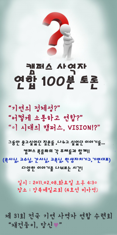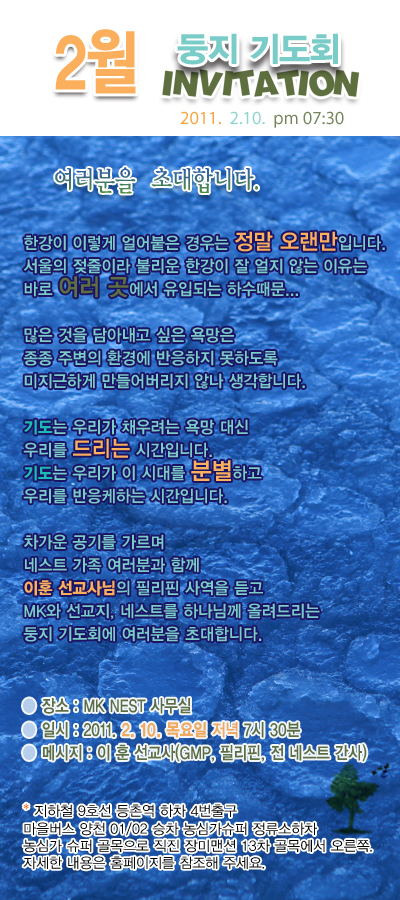 "계속 한국에 가고 싶고 꿈에서 한국에 자주 가고 자꾸 그랬다. 오빠는 나보다 더 심해서 막 한국에 가고 싶다고 울고 떼쓰고, 그렇게 되자 우린 점점 북아프리카/중동 쟈스민 시민혁명과 중동선교의 향후 대책과 전망 ■ 취지 튀니지에서 서민 경제로 인해 촉발된 시위가 졸지에 이집트를 비롯한 중동 [긴급] 일본 대지진/쓰나미/원전사고 이후 일본 선교의 향후 대책과 전망 세미나(안) ■ 취지 일본 대지진 이후 일본의 경제적, 외교적 변화는 불 요즘 집에 가면 시간 마다 텔레비전 뉴스를 봅니다. 일본 사태가 지진과 쯔나미 이래로 긴박감이 한시도 누그러 들지 않고, 오히려 악화되어 가는 것 매월 선교사를 초청하여 선교 이야기를 나누는 중, 이번 달에는 이스라엘 이야기를 듣습니다. 얼마 전 ‘용서’라는 영화를 보았는데, 이스라엘과 팔 세상이 전문화되고, 경쟁이 심화되면서 기존의 전통적 선교의 방법으로는 여러 가지 한계에 부딪히고 있습니다. 이에 주님께서는 다음과 같이 말씀하 샬롬!바쁜 일상생활로 인해서 성경공부를 하지못하는 분들을 위해서 저희 비비엔한국어 방송 성경대학에서는&nbs 동영상 무료강좌(영어성경, 영어찬양, Vocabulary, 히브리어, 헬라어) 카페 정회원은 아래 동영상강좌를 무료로 보실 수 있습니다.1. 성경과 함께하는 Voc 샬롬~^^저희 선교회에서는 2011년 시작을모든 사역자가 함께 하나님의 말씀안에서 하려 합니다. * 날짜 : 2011년 1월3(월)~6(목)일* 장소 : 대부도모든 분 과거 급속한 산업화, 도시화를 겪으면서 농촌 지역의 인구가 서울로 이주함에 따라 과도한 인구 밀집과 함께 지역별 빈부격차 및 도시빈민가 형성이